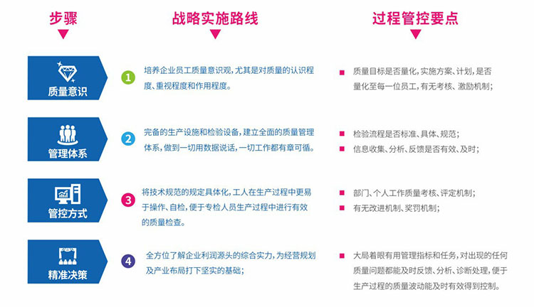 制程管理戰(zhàn)略涵蓋:來(lái)料檢驗(yàn)分析、LQC生產(chǎn)檢驗(yàn)缺陷采集、PQC功能測(cè)試缺陷采集、OQC出貨檢驗(yàn)缺陷采集、抽檢加嚴(yán)、DPPM缺陷分析、SPC分析、制程品質(zhì)能力評(píng)估等。